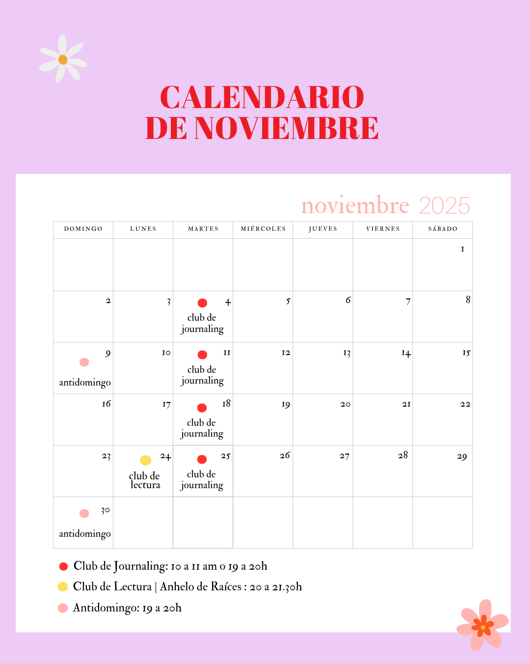 Este es el calendario de actividades del mes. Todos los encuentros quedan grabados para que los hagas a tu ritmo.