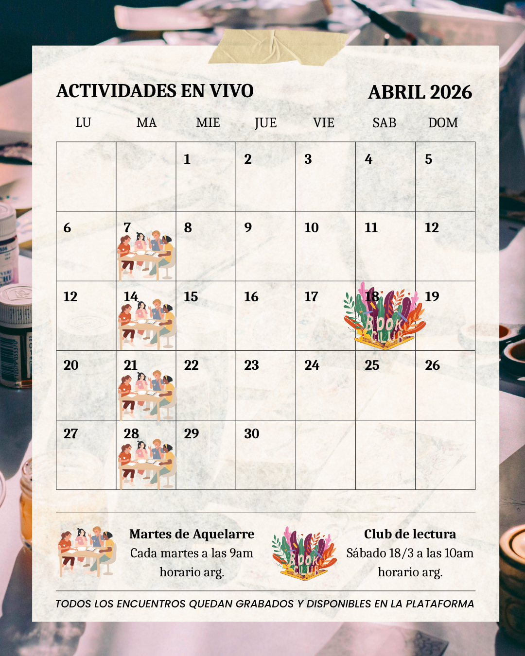 Cada martes a las 9am nos juntamos a través de Meet para reflexionar, escribir y compartir en comunidad. Un espacio íntimo, donde cada voz es escuchada y respetada. Como queda grabado y subido a la plataforma, podés hacerlo en otro horario dentro de tus posibilidades.